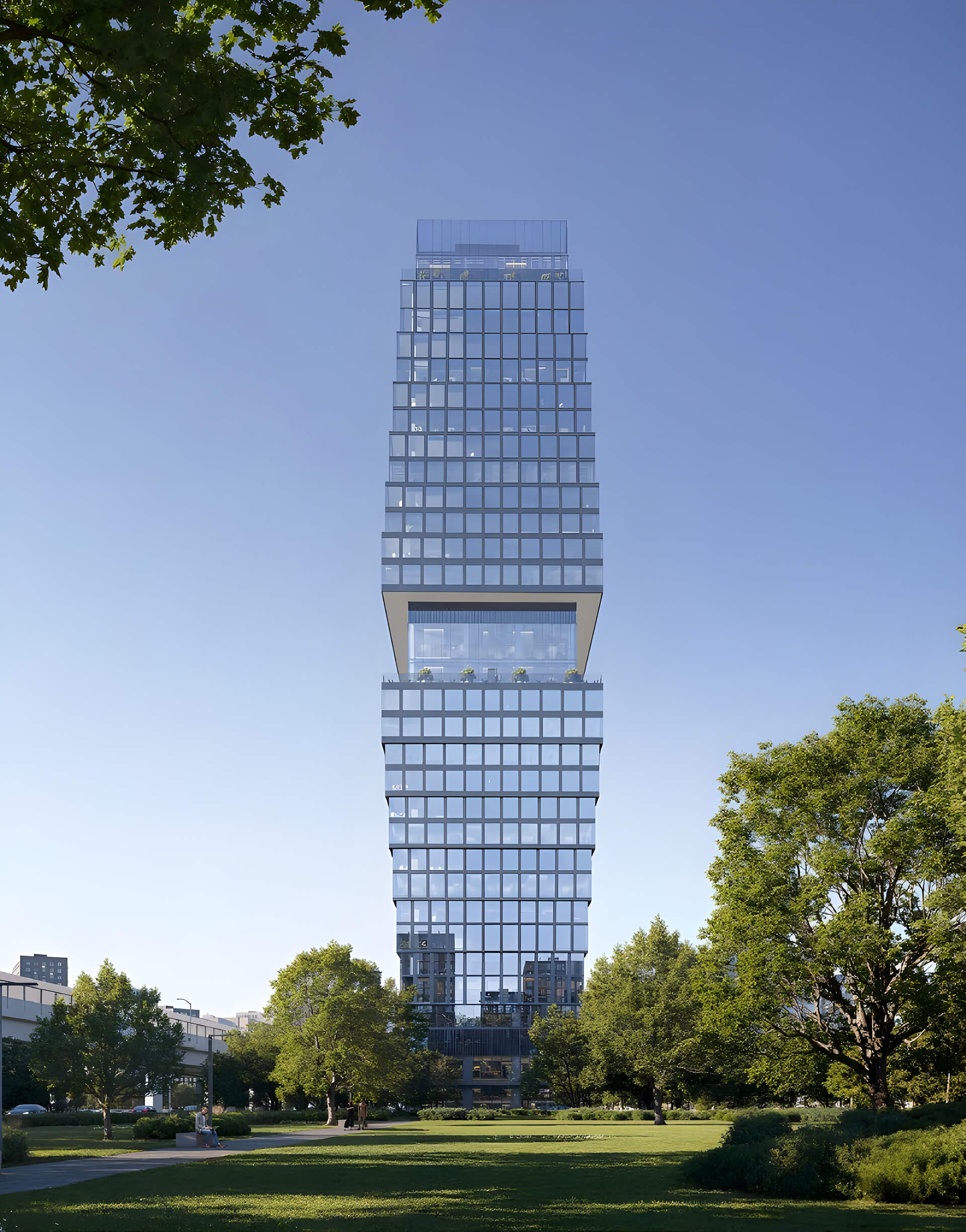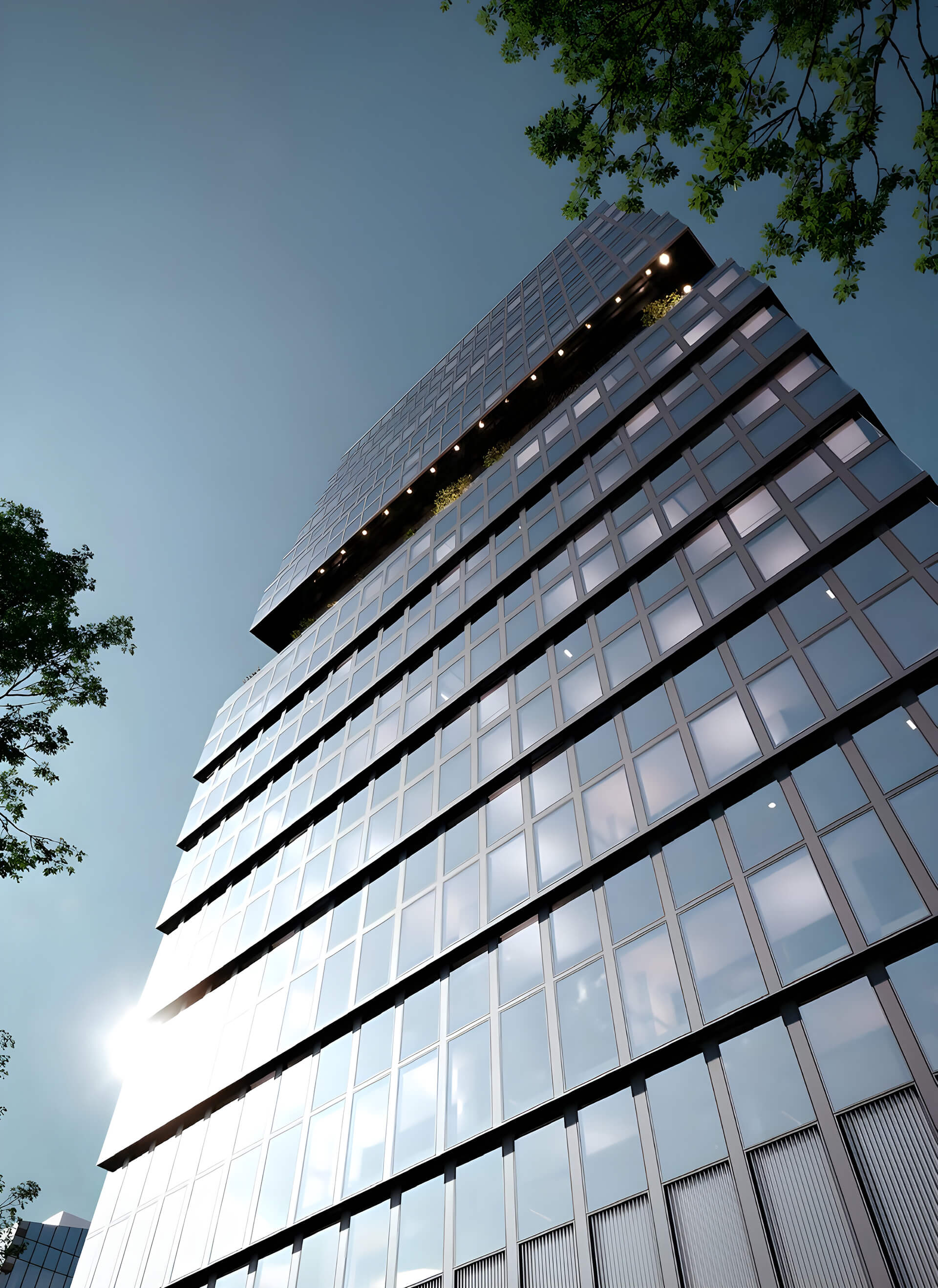 Архитектура Omni Tower — это синтез эстетики и инженерной точности. Башня отличается стройной вертикалью и изящным силуэтом, который подчеркивает динамику современного города. Её форма с плавным сужением к основанию и вершине создает ощущение лёгкости и устремлённости вверх. Благодаря террасированию этажей, фасады словно «движутся» в пространстве, отражая игру света и создавая уникальный визуальный ритм.